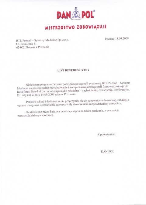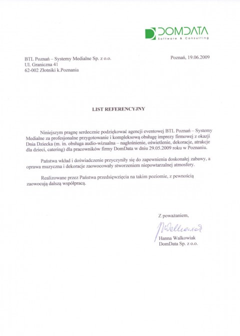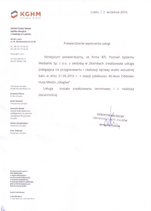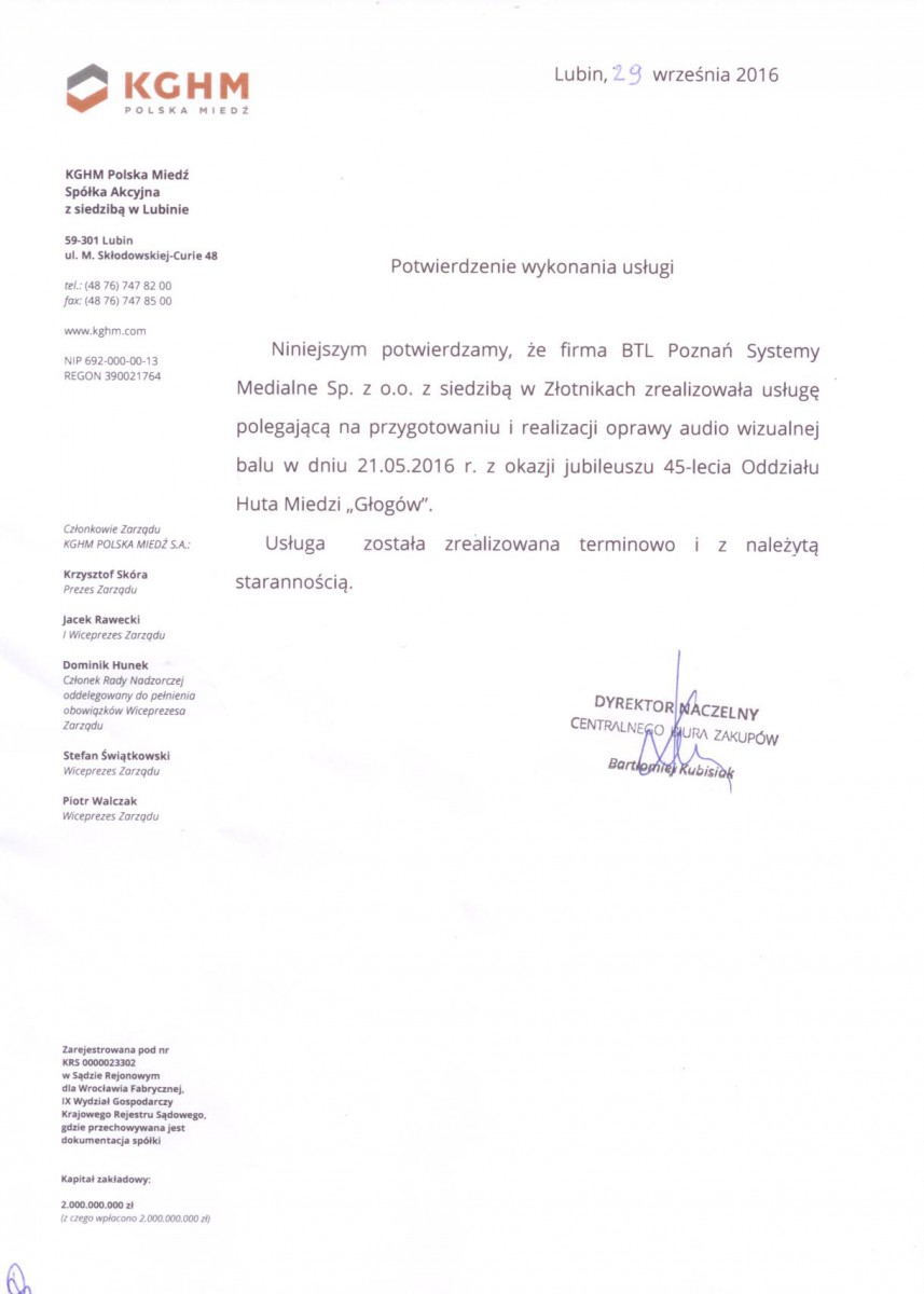 W nawiązaniu do współpracy z Państwa firma podczas 45-lecia Huty Miedzi w Głogowie w dniu 21.05.2016 chciałam serdecznie podziękować Państwu za profesjonalizm, rzetelność oraz za błyskawiczne reakcje na nasze prośby dotyczące nagłośnienia i oświetlenia :)